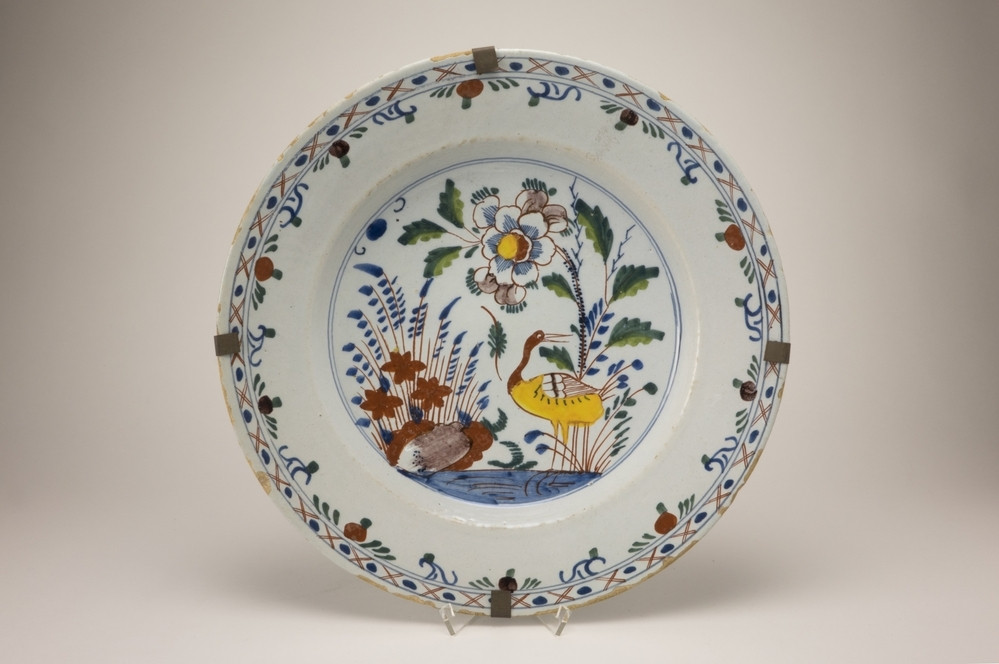 Grijs wit bord met meerkleurige Chinoiserie decoraties in ijzerrood, geel, groen, bruin en blauw. Op het plat o.a. een vogel, water, een rots en planten. De rand heeft een gestyleerde band van arceringen en bloemtakjes.
