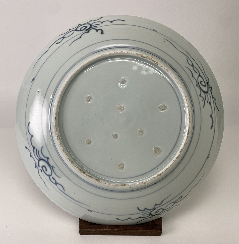 Schaal op voetring, vlakke rand. Zwaar gepot. Versierd in onderglazuur blauw met een patroon van 'gebroken ijs'. Hier over zijn drie grote circel uitgespaard welke gedecoreerd zijn met twee vliegende duiven boven riettakken, een vliegende vogel boven de golven en een karper tussen waterplanten. Verder zijn er tien kleine cirkels aangebracht. De achterzijde is versierd met drie lijnen en vier wolkmotieven in een grijsblauwe kleur. Op de basis zijn negen proenmoeten aanwezig. Deze schotel is kenmerkend voor een gevarieerde, maar nog slecht bestudeerde groep Nagasaki Japans export porselein dat in heel Zuid-oost Azië wordt aangetroffen. Het zijn grotendeels schotels met een vereenvoudigde voorstelling van onder andere landschappen, vogels, vissen en geometrische motieven.
