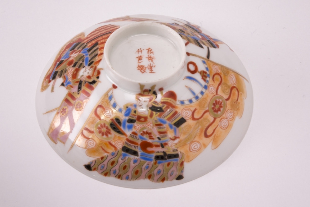 Wit Satsuma eierschaal dekseltje met op de buitenzijde drie krijgers in meerdere kleuren.