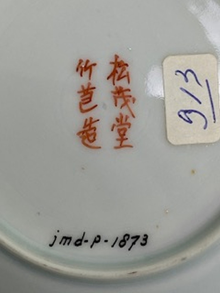 Wit Satsuma eierschaal schoteltje met op het plat drie krijgers in meerdere kleuren.