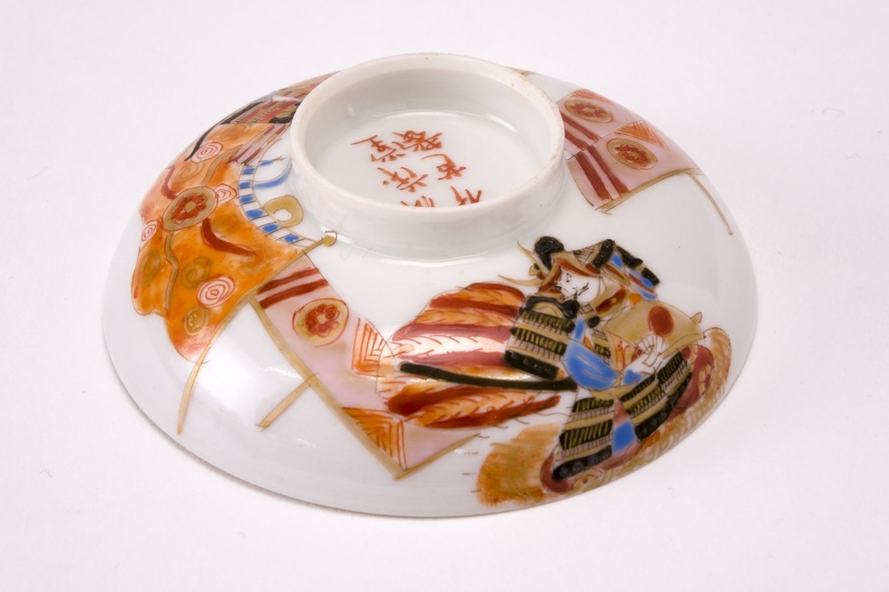 Wit Satsuma eierschaal dekseltje met op de buitenzijde twee krijgers in meerdere kleuren.