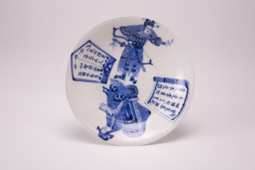 Wit eierschaal schoteltje met op het plat, in blauw, 1 krijger, een zittende vrouw en twee vlakken met tekst. Edo periode