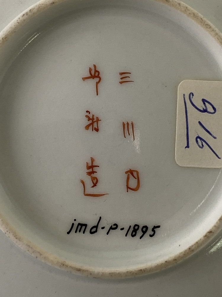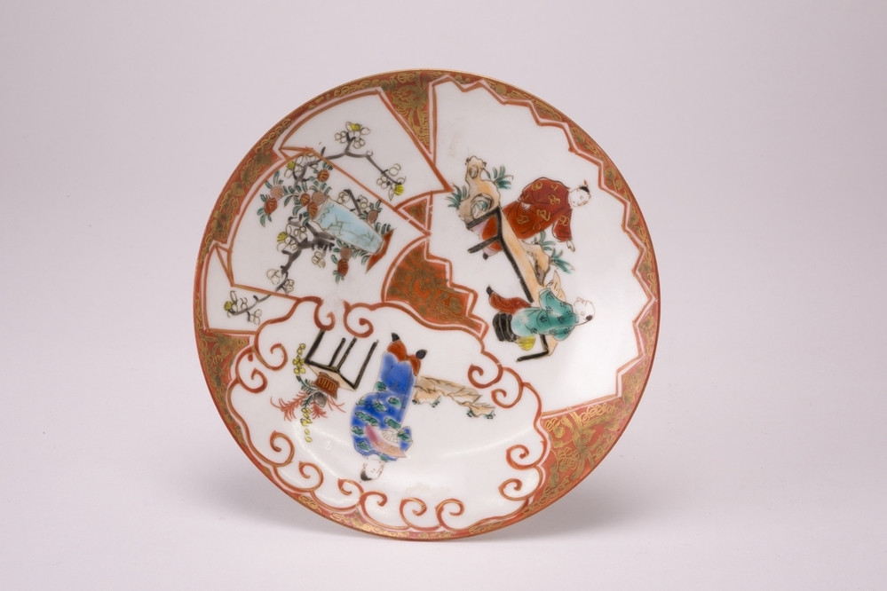 Wit eierschaal schoteltje met op het plat drie cartouches met daarin een vaas met takken, twee personen aan een tafen en 1 persoon met waaier in meerdere kleuren.