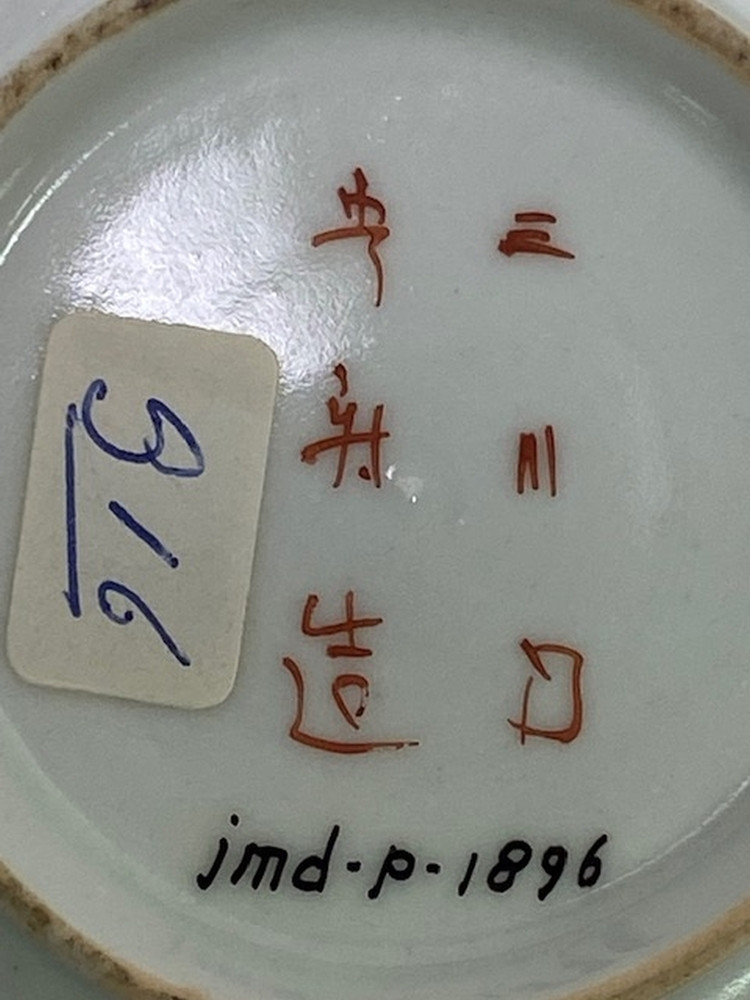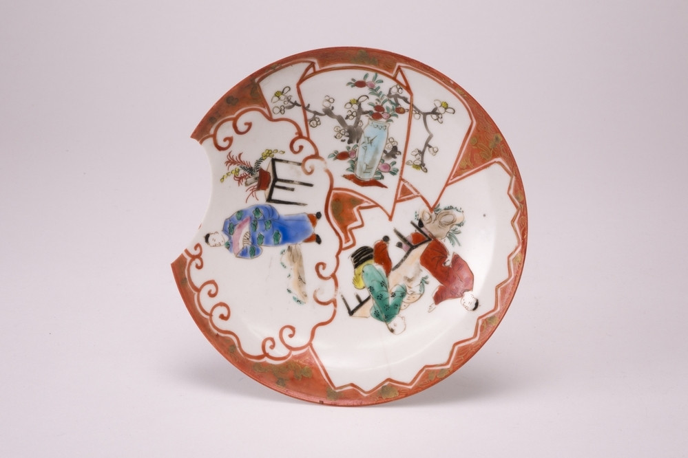 Wit eierschaal schoteltje met op het plat drie cartouches met daarin een vaas met takken, twee personen aan een tafen en 1 persoon met waaier in meerdere kleuren.