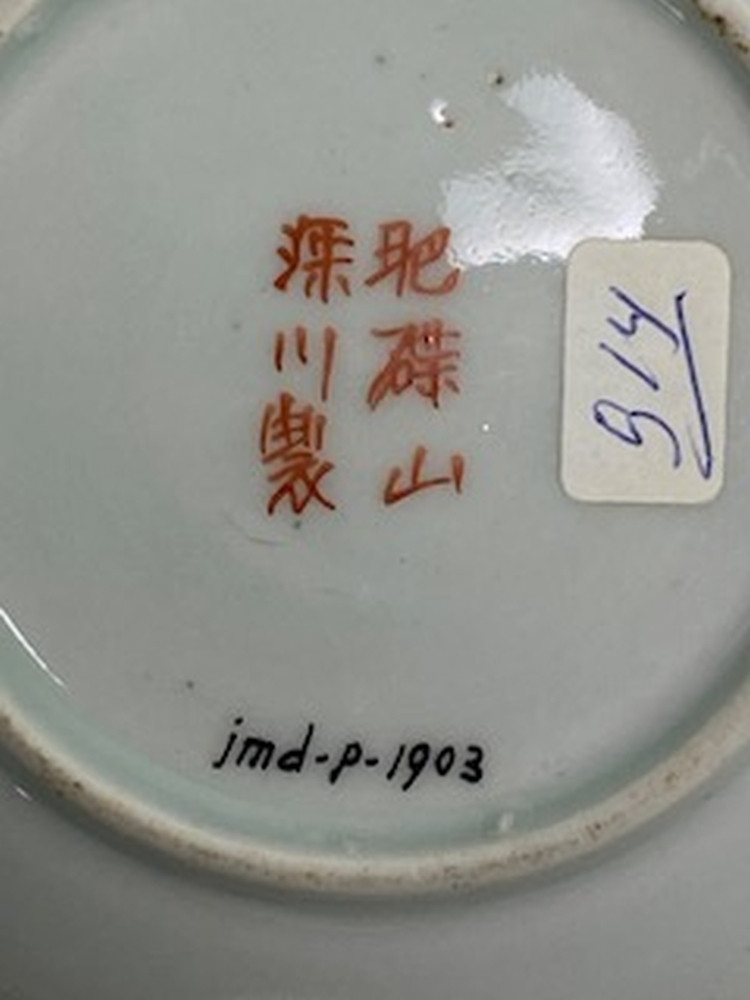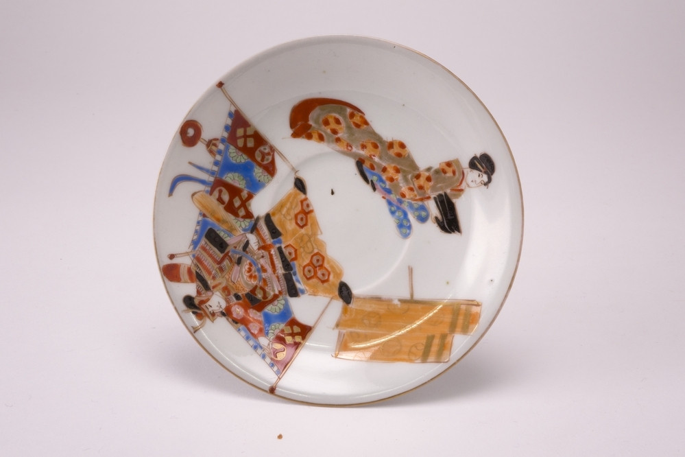 Wit schoteltje met ijzerrode rand en op het plat drie cartouches met daarin een landschapje met bloemen en vogel, drie personen aan een tafel en in de laatste 1 zittende persoon en twee staande personen in meerdere kleuren.Meiji, 19e eeuw.