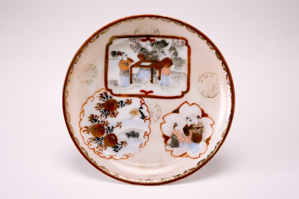 Wit schoteltje met ijzerrode rand en op het plat drie cartouches met daarin een landschapje met bloemen en vogel, drie personen aan een tafel en in de laatste 1 zittende persoon en twee staande personen in meerdere kleuren.