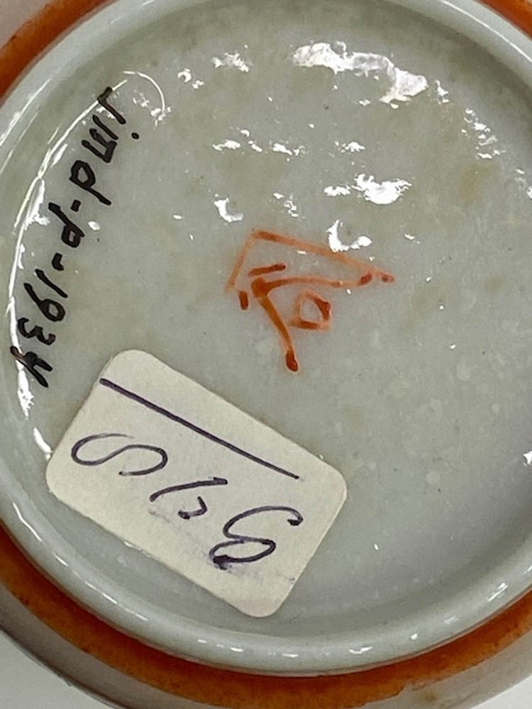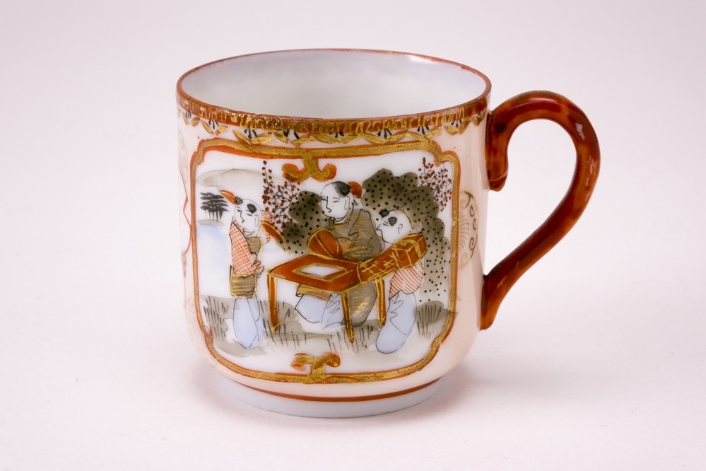 Wit kopje met oor en ijzerrode rand. Op de buitenzijde drie cartouches met daarin een landschapje met bloemen en vogel, drie personen aan een tafel en in de laatste 1 zittende persoon en twee staande personen in meerdere kleuren.