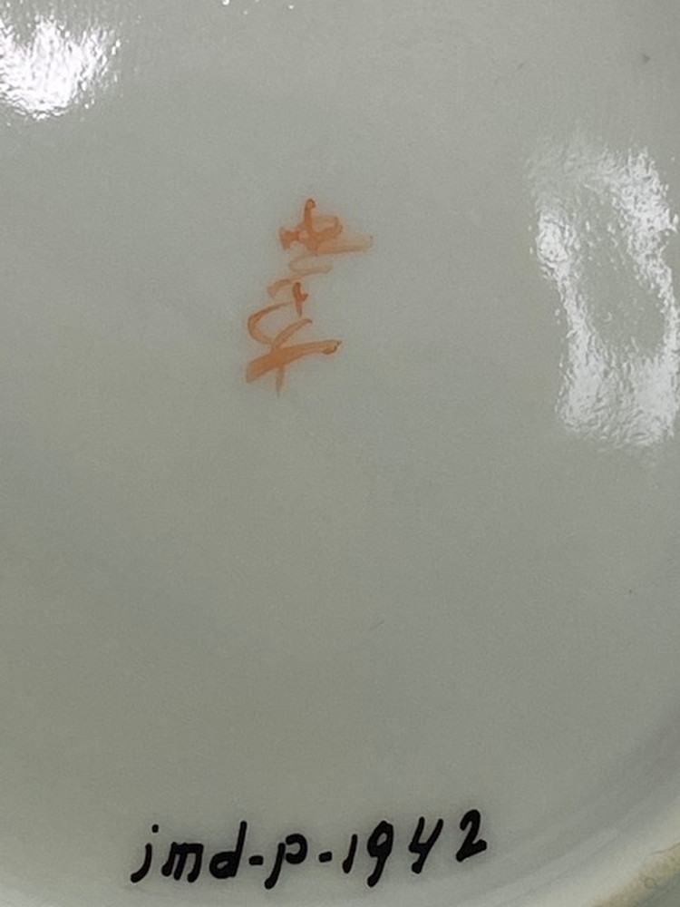 Wit schoteltje met geschulpte rand. Langs de rand een versiering in zwart,ijzerrood en goud. Op het plat een landschapdecor met bergen, huizen en twee personen, in zachte tinten.
