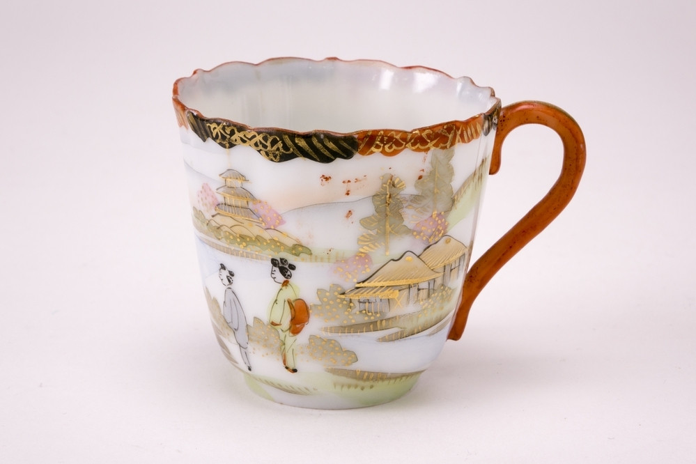 Wit kopje met oor en geschulpte rand. Langs de rand een versiering in zwart,ijzerrood en goud. Op de buitenzijde een landschapdecor met bergen, huizen en twee personen, in zachte tinten.