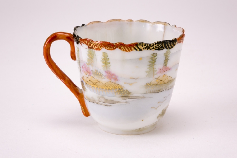 Wit kopje met oor en geschulpte rand. Langs de rand een versiering in zwart,ijzerrood en goud. Op de buitenzijde een landschapdecor met bergen, huizen en twee personen, in zachte tinten.