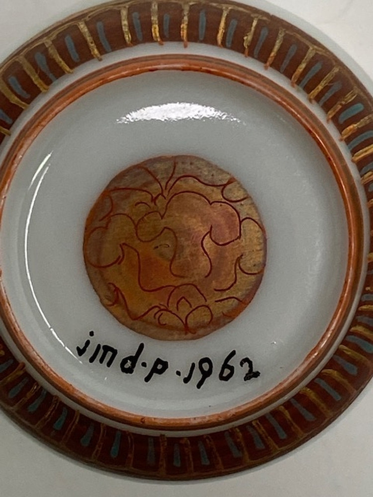 Wit dunwandig kopje met oor en goudkleurige rand en op de buitenzijde een rij Japanse mannen.
