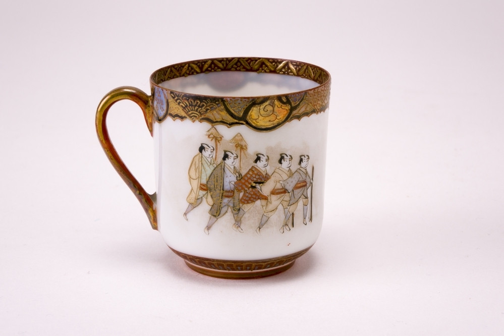 Wit dunwandig kopje met oor en goudkleurige rand en op de buitenzijde een rij Japanse mannen.