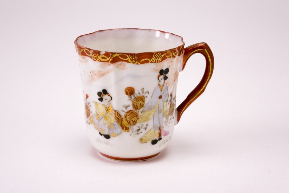 Wit Satsuma kopje met oor en gegolfde rand. Langs de rand een versiering in ijzerrood en goud. Op de buitenzijde een landschapdecor met bergen en twee personen, in zachte tinten.