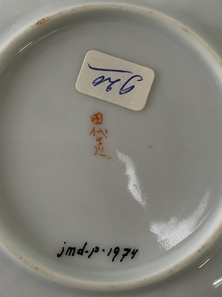 Wit Satsuma schoteltje met gegolfde rand. Langs de rand een versiering in ijzerrood en goud. Op het plat een landschapdecor met bergen en twee personen, in zachte tinten.