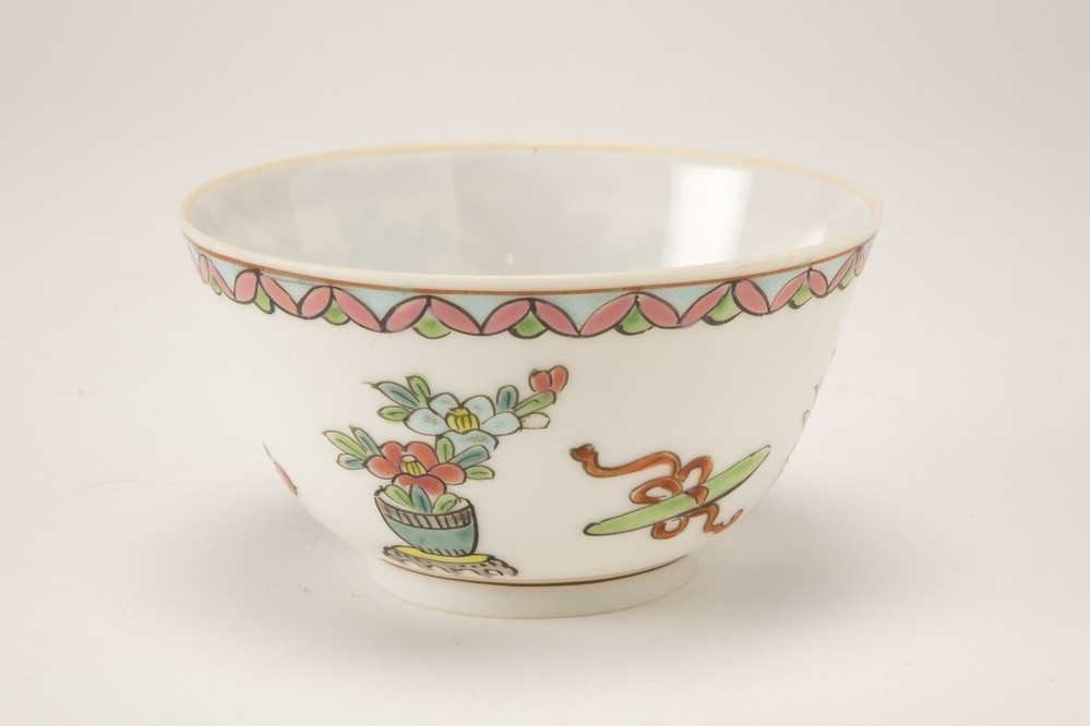 Wit kommetje zonder oor meerkleurige decoraties met bloemenvazen op tafeltjes.