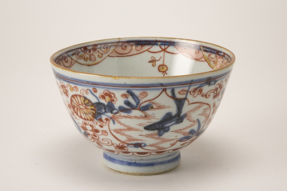 Witte Amsterdams bont kom op standring met op de binnen- en buitenzijde bloemdecoraties in ijzerrood en goud. Hieronder blauwe decoraties met o.a. vissen.