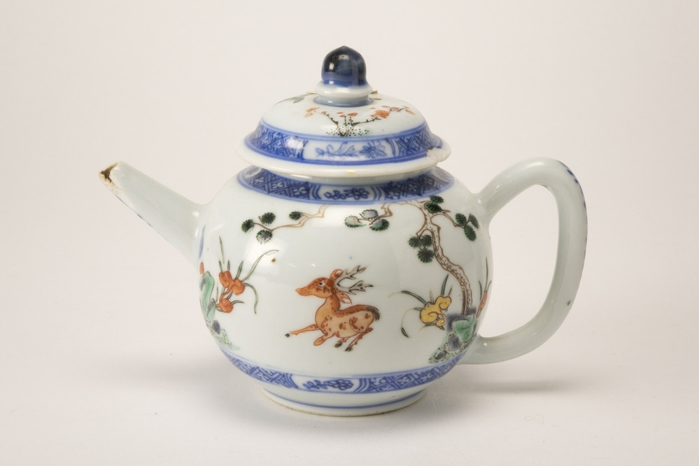 Wit theepotje met rechte tuit en oor. Op de buitenzijde boven, onder en op het dekseltje een blauwe sierrand. Hiertussen meerkleurige famille verte decoraties met bomen, een hertje en een vogel in ijzerrood, groen, zwart, bruin en goud.