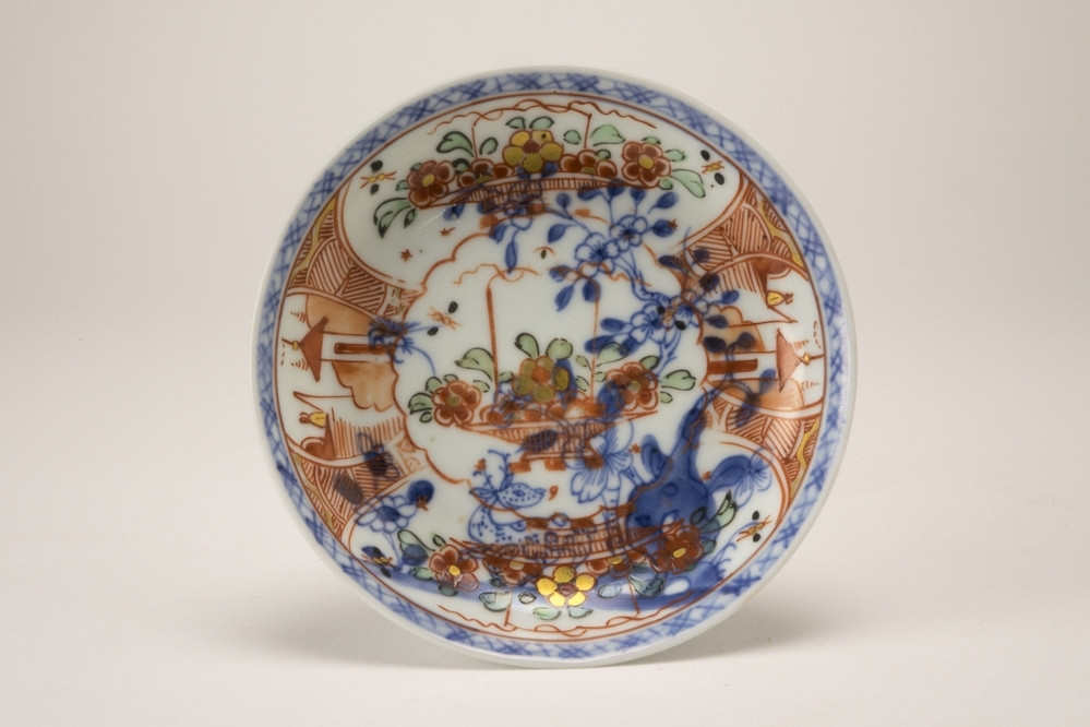 Amsterdams bont schoteltje. Op het plat een blauwe bloementak met hieroverheen een hengselmand. Langs de rand een blauwe band. Hieroverheen vier uitsparingen met hierin een hengselmand en in de twee anderen een landschapje.