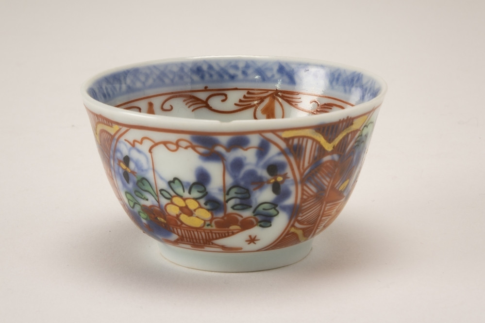 Amsterdams bont kom op standring. Op de bodem een hengselmand. Langs de binnenrand een ijzerrode guirlandeversiering aan een blauwe band. Aan de buitenrand en onderzijde een blauwe band. Hiertussen vier uitsparingen met hierin een hengselmand en in de twee anderen een landschapje.