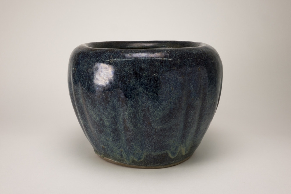 Grote pot zonder deksel met een naar binnen gebogen rand. Op de buitenzijde een afstromende glazuurlaag in donkerblauw en geel-groen.