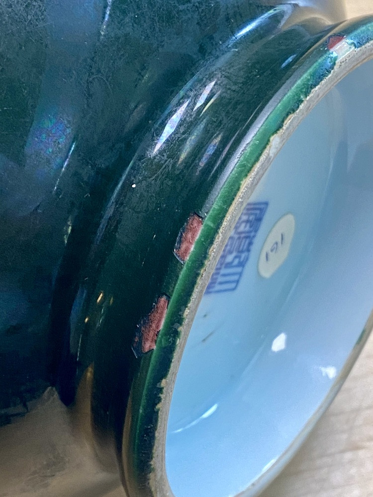 Grote balustervormige vaas met uitlopende hals (Yuhuchunping). De buitenzijde heeft een egaal donkergroen, enigszins mat glazuur. Deze groene glazuurlaag is vermoedelijk over de oorspronkelijke rode glazuurlaag aangebracht!