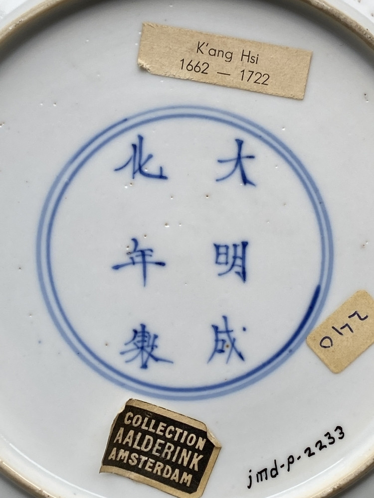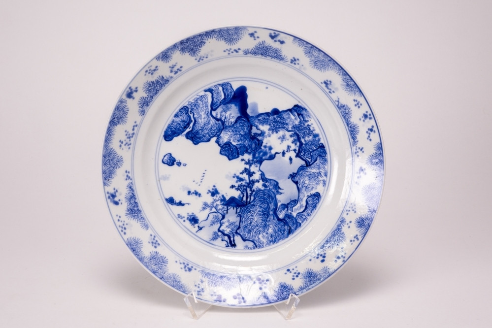 Bord op voetring, platte rand. Versierd in onderglazuur blauw met een berglandschap met een rivier en bomen. Op een plateau rechts drie minuscule figuurtjes, een vissersboot op het water, een afdak op palen op de oever. Op de rand een patroon van groepen pijnboomnaalden en stippen. Op de achterkant twee maal een gestyleerd rivierlandschap met bergen. Onder op de bodem het zes-karakter merk Chenghua in een dubbele cirkel. Het landschap is geschilderd in de stijl van ‘the master of the rocks’(zie cat. 51{}), waarbij korte, elkaar overlappende boogjes gebruikt worden. Het geheel maakt daardoor een complexe indruk. De menselijke elementen (de drie figuurtjes, de boot, het afdak) vallen in het niet bij de overweldigende natuur, een weergave die in de Chinese landschapsschilderkunst een eerbiedwaardige traditie kent en in deze tijd een revival beleefde. De stippen op de rand zijn kenmerkend voor het laat 17e-eeuwse Kangxi porselein. Dergelijke bordjes zijn niet zeldzaam en werden ook naar het Westen verscheept.