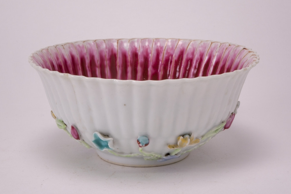 Famille rose kom met op plat een tak met een pioenroos. De bnnenwand rondom vele in relief aangebrachte bloemblaadjes met een verlopende ros-rode emaille. Aan de buitenzijde, langs de onderkant rondom diverse meerkleurige, in relief aangebrachte bloemen.