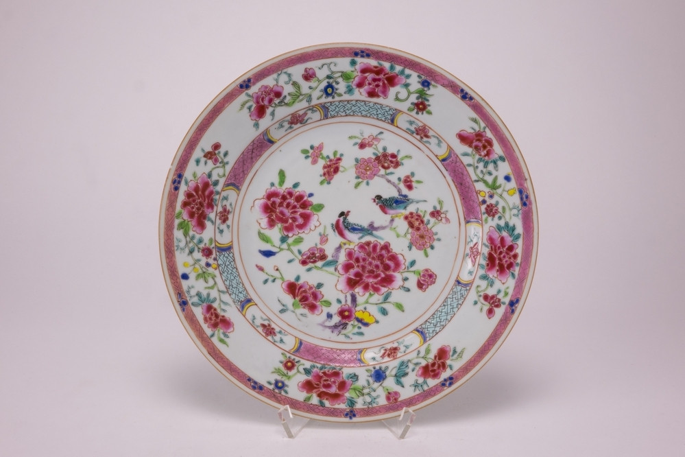 Plat famille rose bord met op het plat een pioen- en vogeldecor. Hier omheen een band in roze en lichtblauw, onderbroken door een vlak met een bloemtakje. Op de rand vier veelkeurige bloemtakken met pioenrozen. Op de rand een smalle roze band. Op de lip een bruine lijn.