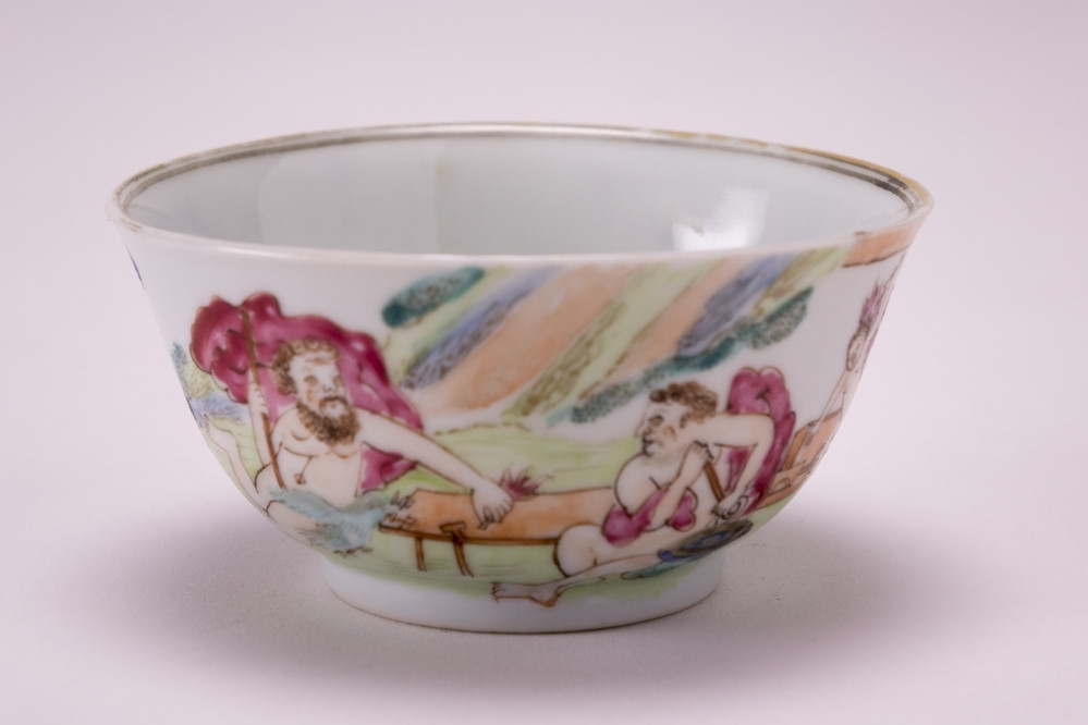 Kommetje met op de buitenzijde in emailkleuren en goud met een allegorische voorstelling van het element Vuur. In het midden van de voorstelling is Jupiter te zien, god van het licht en de (stralende) hemel en alle natuurverschijnselen. Rechts afgebeeld is Vulcanus, god van het vuur en het smidswerk. In de wolken in een wagen zit Venus, de godin van de liefde. Rondom verschillende Amors, zij symboliseren de kracht die staal en diamant kunnen doorboren, en zelfs de harten van de goden. De voorstelling is bijzonder amateuristisch geschilderd.De prent die als voorbeeld diende werd gemaakt door Antoine Herisset (1685-1769) naar een schilderij van Francesco Albani (1578-1669). De voorstelling is uit een serie van vier, de andere elementen zijn Water, Lucht en Aarde. Alle elementen zijn uitgebeeld door dezelfde kunstenaars, op schilderij en op prent. Al deze voorstellingen komen voor op porselein.