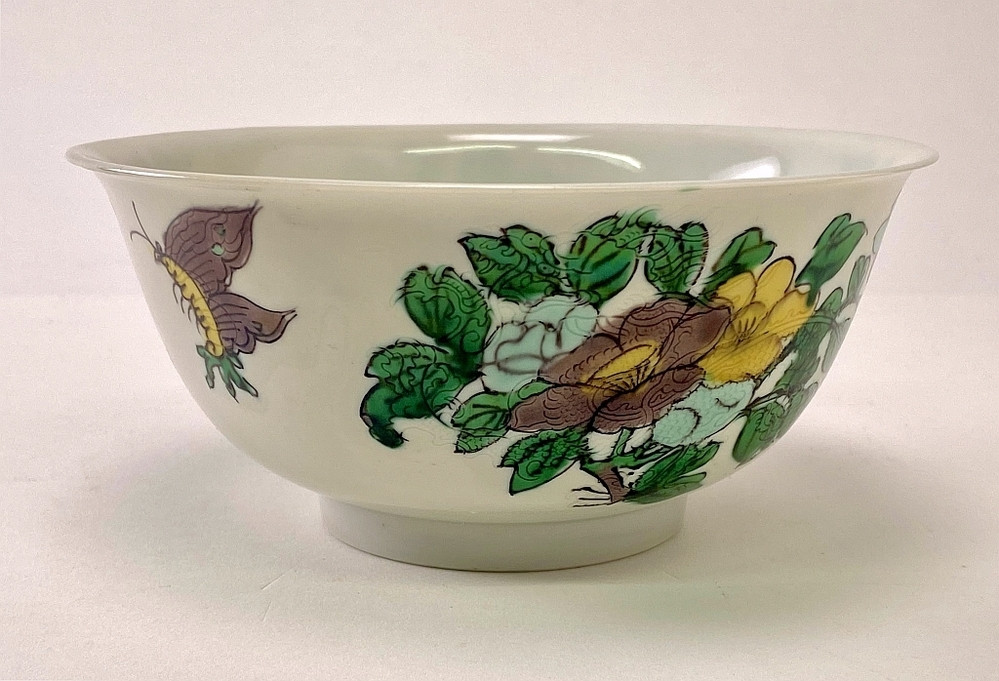 White bowl with spreading rim, with green, purple and yellow floral decorations with two butterflies on the outside. (décor Tao Kwang) Below the decoration decorated with inscribed five-clawed dragons, cloud motifs and flaming pearls under the glaze. Marked on underside.