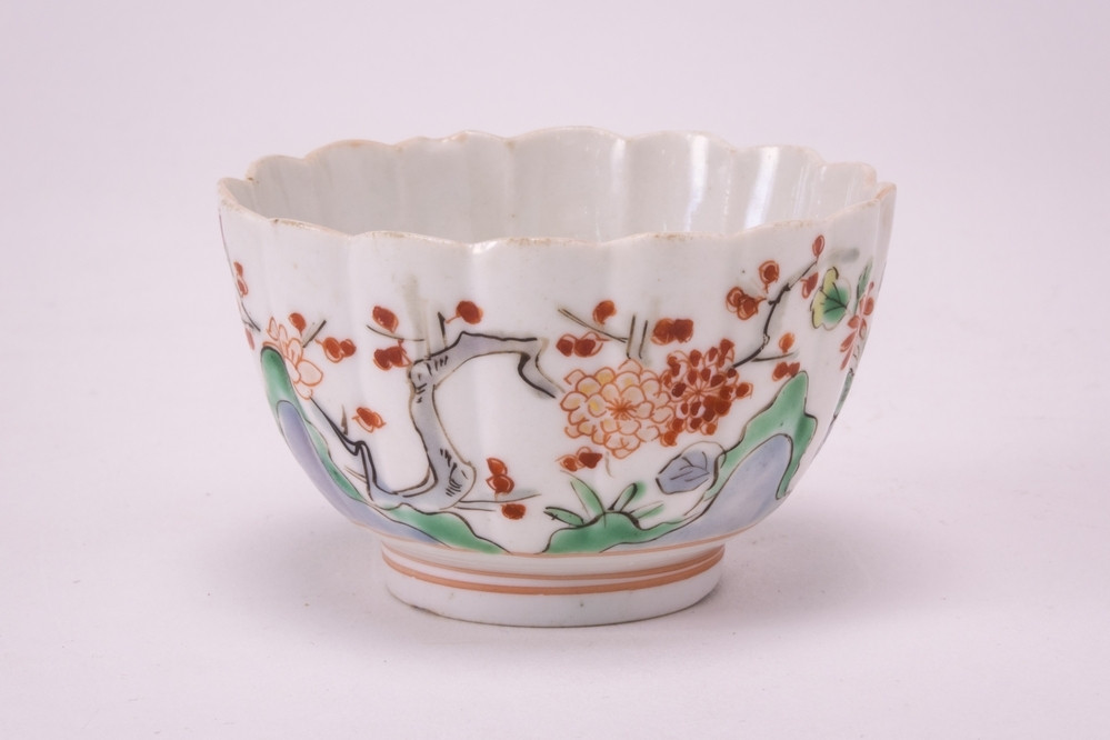 Wit kommetje met gelobde rand op standring. Op de buitenzijde en op de bodem famille verte bloemdecoraties.