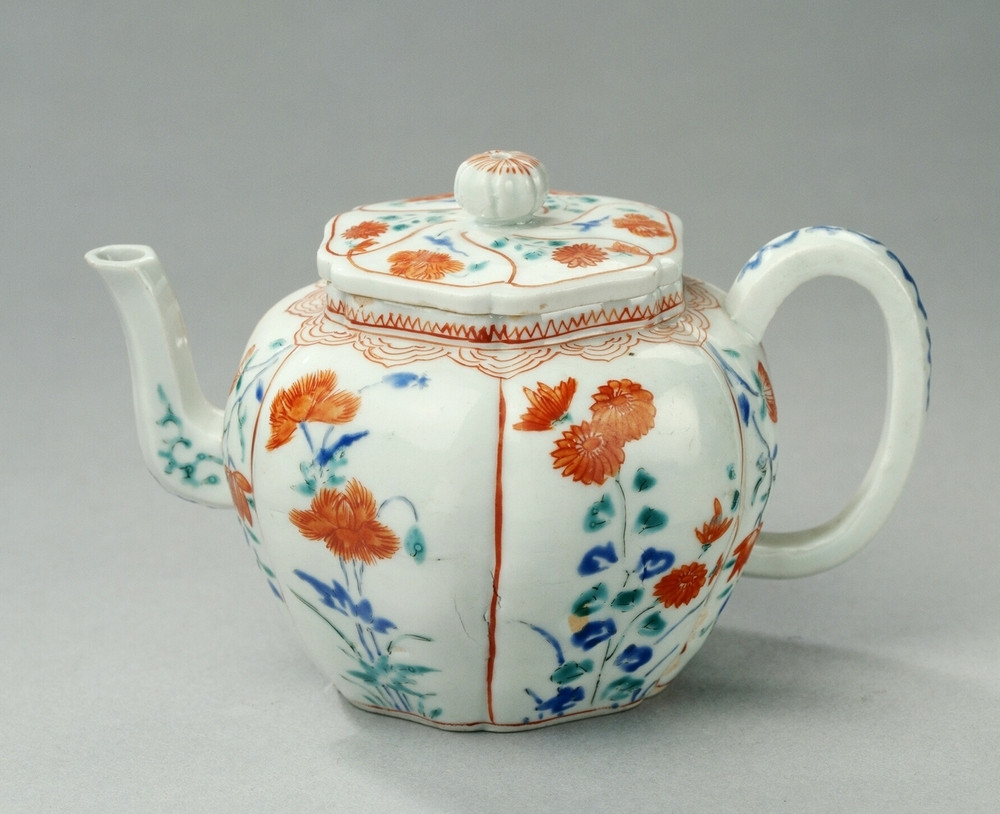 Hexagonal lobed teapot on low footring of the same shape. Flat lid with lobed rim and round, ribbed knob. Right-angled S-shaped spout, flat C-shaped handle. Kakiemon, decorated in blue, yellow, green, iron-red and black enamels with flowering poppies and chrysanthemums in the panels. Around the mouthrim a lambrequin band. On the lid flower sprays in the wavy panels. This teapot exemplifies the refinement of enamelled Kakiemon porcelain. The flowering plants have plenty of surrounding space, the execution is accomplished, the opaque colours well matched, and the details outlined in very thin black. Kakiemon teapots occur in several variations. There are also teacups and saucers, but they do not match the teapots. Such teaware was intended primarily for export. Apparently, very little Kakiemon was produced for the domestic Japanese market.