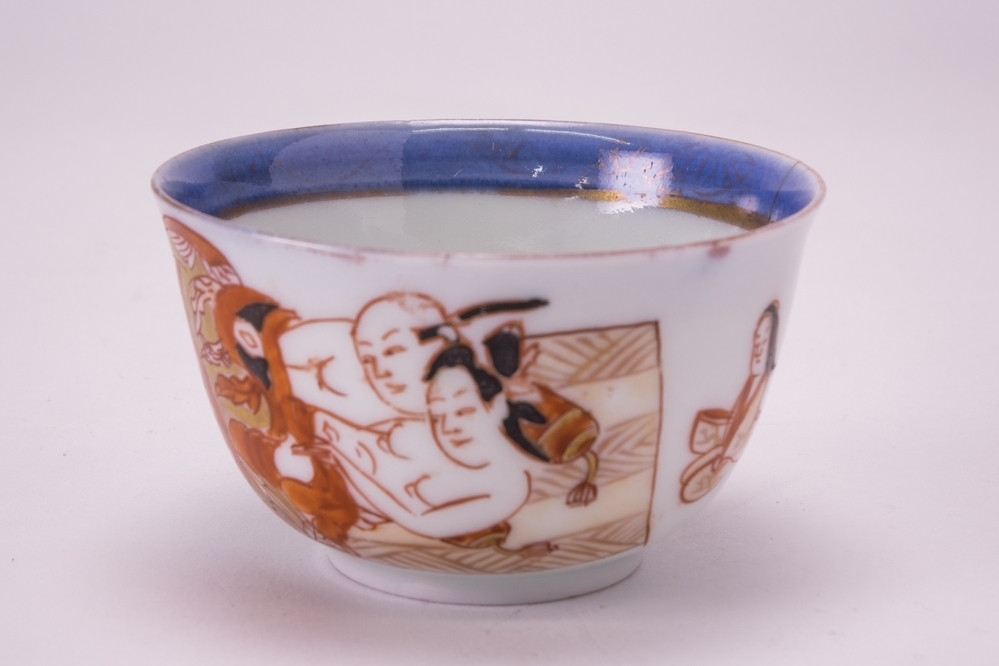 Kopje op voetring, spreidende wand. Imari, versierd in onderglazuur blauw, ijzerrood, zwart en goud met een naakt paar op een matras, half onder een deken. Aan het hoofdeinde een knielende dienares, een waaier, een kaarsenhouder en een bak met potjes en een penseel. Op de rand een rankpatroon in goud op een blauwe grond. Binnenin op de bodem van het kopje een parende haan en hen. Op de achterkant van de schotel een prunus, een chrysant en een camelia. Erotische en pornografische scenes waren een populair genre in de Japanse prentkunst (shunga), maar op porselein komen ze zelden voor, nog minder zelfs dan op Chinees porselein. Hier is de gebruikelijke iconografie gebruikt: het paar half onder een deken met de toekijkende dienares of leerlinge van de courtisane. Het motief van de haan en de hen benadrukt het thema nog extra. Een identiek kop en schotel bevindt zich in de collectie van Kasteel Loosdrecht (Inv. 8218/9, ongepublicerd). Voor de Westerse eigenaar was een set theekoppen en schotels met zo'n voorstelling uiteraard iets heel exotisch en begerenswaardigs. Vergelijkbare stukken in de literatuur zijn onbekend. In de Van Diepen collectie bevinden zich nog vier identieke kopp...