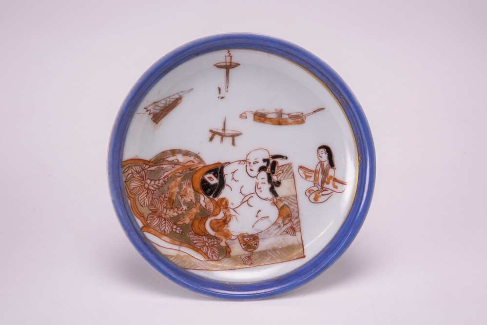 Schotel op voetring, spreidende wand. Imari, versierd in onderglazuur blauw, ijzerrood, zwart en goud met een naakt paar op een matras, half onder een deken. Aan het hoofdeinde een knielende dienares, een waaier, een kaarsenhouder en een bak met potjes en een penseel. Op de rand een rankpatroon in goud op een blauwe grond. Binnenin op de bodem van het kopje een parende haan en hen. Op de achterkant van de schotel een prunus, een chrysant en een camelia. Erotische en pornografische scenes waren een populair genre in de Japanse prentkunst (shunga), maar op porselein komen ze zelden voor, nog minder zelfs dan op Chinees porselein. Hier is de gebruikelijke iconografie gebruikt: het paar half onder een deken met de toekijkende dienares of leerlinge van de courtisane. Het motief van de haan en de hen benadrukt het thema nog extra. Een identiek kop en schotel bevindt zich in de collectie van Kasteel Loosdrecht (Inv. 8218/9, ongepublicerd). Voor de Westerse eigenaar was een set theekoppen en schotels met zo'n voorstelling uiteraard iets heel exotisch en begerenswaardigs. Vergelijkbare stukken in de literatuur zijn onbekend. In de Van Diepen collectie bevinden zich nog vier identieke ko...