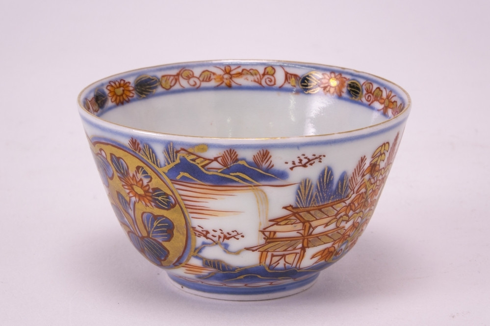 Imari kopje gedecoreerd in goud, blauw, ijzerrood en oranje.