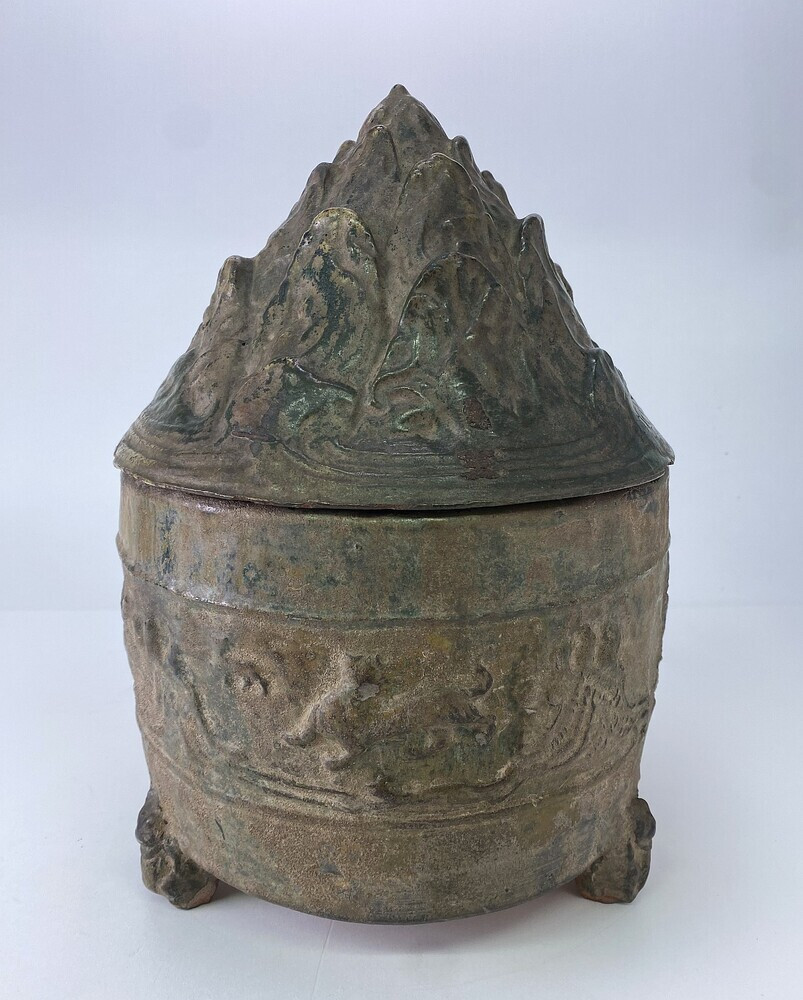 Urn of heuvelpot, aardewerk. De wierookbrander (grafgift) is bedekt met een groene geïriseerde loodglazuur op een rood gebakken scherf. De versiering is in reliëf. Op de wand een berglandschap, waarin een jachtscene met ruiters en dieren, twee keer onderbroken door een dierenkop met een ring in de bek. De deksel heeft de vorm van een bergmassief en symboliseerd het eiland van de gelukzaligen P' êng Lai. De drie pootjes zijn in de vorm van een dierenkop met voorpoten. Lunsing-Scheurleer; Urn met deksel op drie pootjes; z.g. Heuvelpot. De cilindervormige romp is versierd met geapliceerde reliëfjes van beesten met twee kopjes met een ringetje. Het deksel in de vorm van bergen symboliseert het eiland van de Gelukzaligen P'êng lai. Hier gaan de gestorvenen heen, voordat zij onsterfelijk worden. Roodbakkende klei bedekt met groen enigszins iriserend glazuur. Het Gemeentemuseum te Den Haag bezit een verwant exemplaar. B. Jansen, Chinese Ceramiek, Den Haag 1976, pl.8.