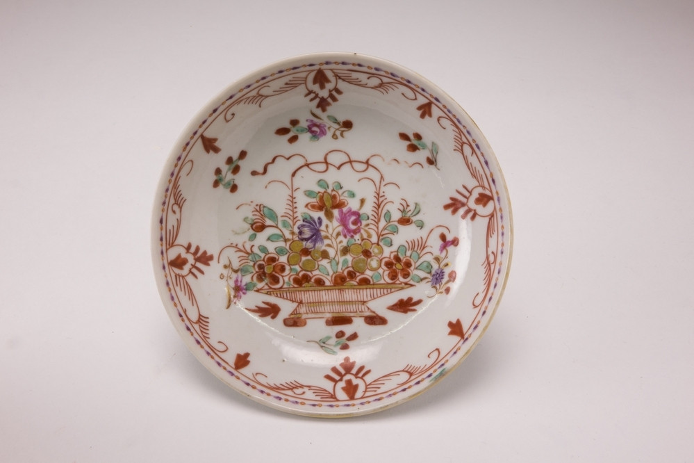 Schotel, Chinees porselein, met in Holland aangebrachte beschildering, Amsterdams bont, in rood, blauw, groen en goud, 18de eeuw. Plat: een een rijkversierde hengselmand en bloemversieringen. Rand: een guirlande versiering in ijzerrood en zwart.