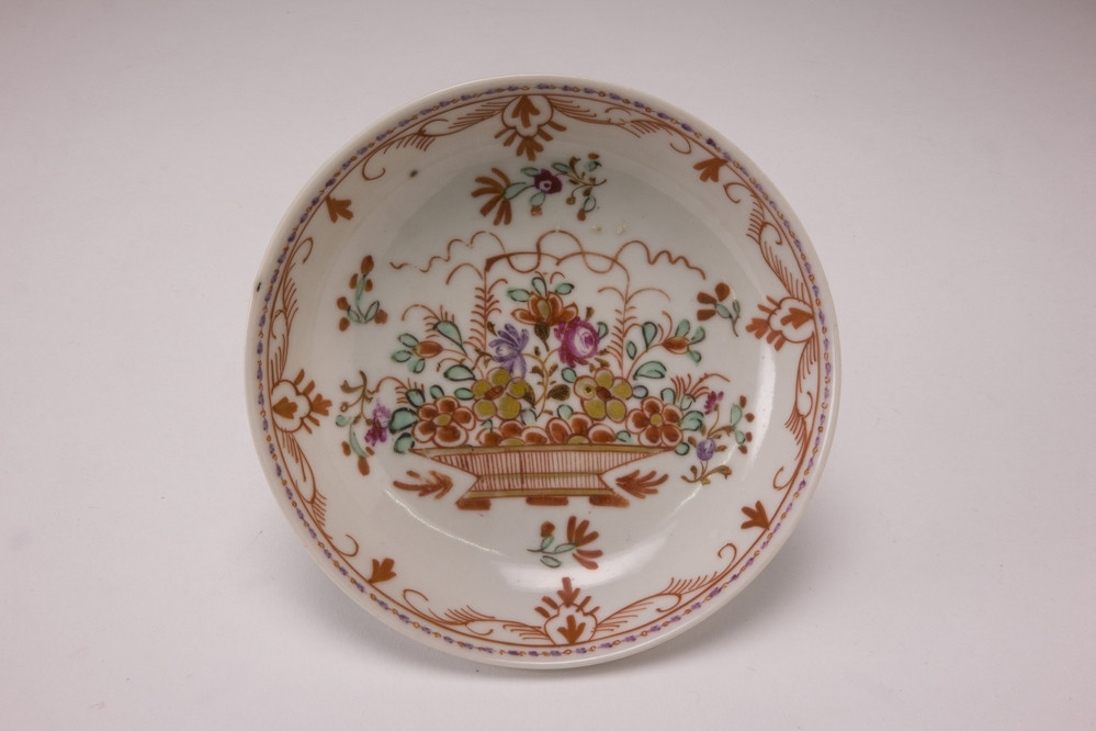 Schotel, Chinees porselein, met in Holland aangebrachte beschildering, Amsterdams bont, in rood, blauw, groen en goud, 18de eeuw. Plat: een een rijkversierde hengselmand en bloemversieringen. Rand: een guirlande versiering in ijzerrood en zwart.