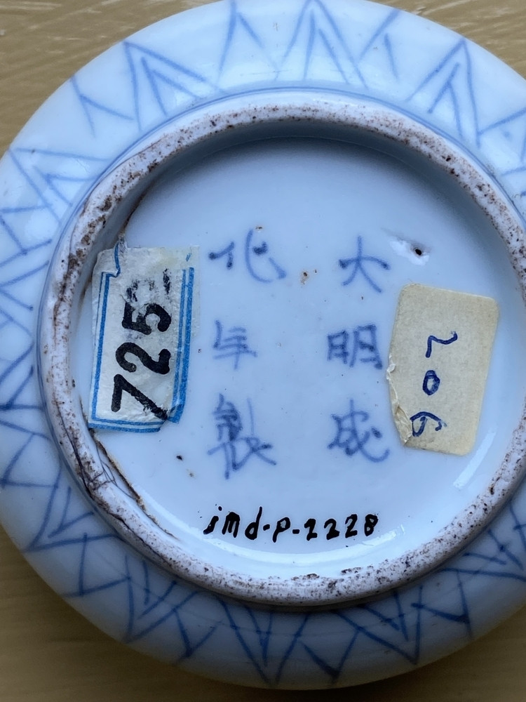 Klein plat penseelpotje zonder deksel met fijn blauw lijndecor. De bovenste helft een rondom een bloemdecor. De onderste helft bestaat uit rondom aangebrachte blaadtjes.