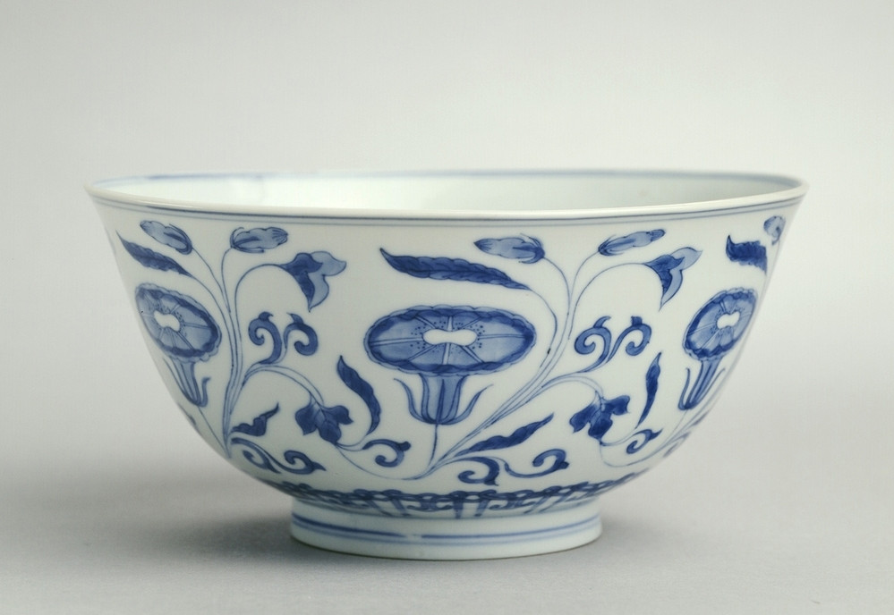 Bowl on footring, spreading sides. Decorated in underglaze blue with a continuous motif of finely painted scrolls with trumpet flowers. Inside on the base a similar trumpet flower in a circle. Around the foot a band with lotus-petal shaped motifs, formed{?J} by scrolls. On the base the six-character mark Chenghua in a double circle. The decoration evokes similar richly varied continuous flower and scroll patterns of the Ming period, a source of inspiration possibly also indicated by the Ming mark.
