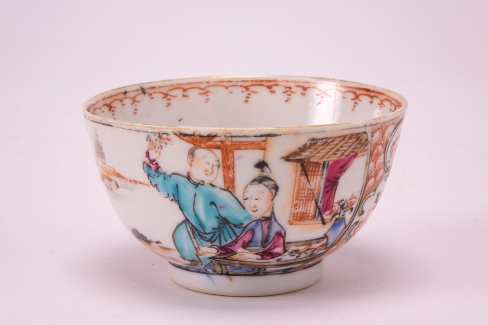 Kommetje zonder oor met op de buitenzijde veelkleurige Mandarijn- landschapdecors met o.a. drie volwassenen en een kind. De versiering is kenmerkend voor de groep die in Nederland ‘mandarijn’ genoemd wordt, verwijzend naar de naam die in het Westen aan alle Chinese ambtenaren gegeven werd. Daarbij wordt vaak paars, oranje, geel, een hard roze en bruin email toegepast, terwijl als onderwerpen meestal Chinese figuren en familietaferelen geschilderd zijn. In Groningen heet de variant met goud (zoals hier) ‘herenmandarijn’, de variant zonder goud ‘boerenmandarijn’.