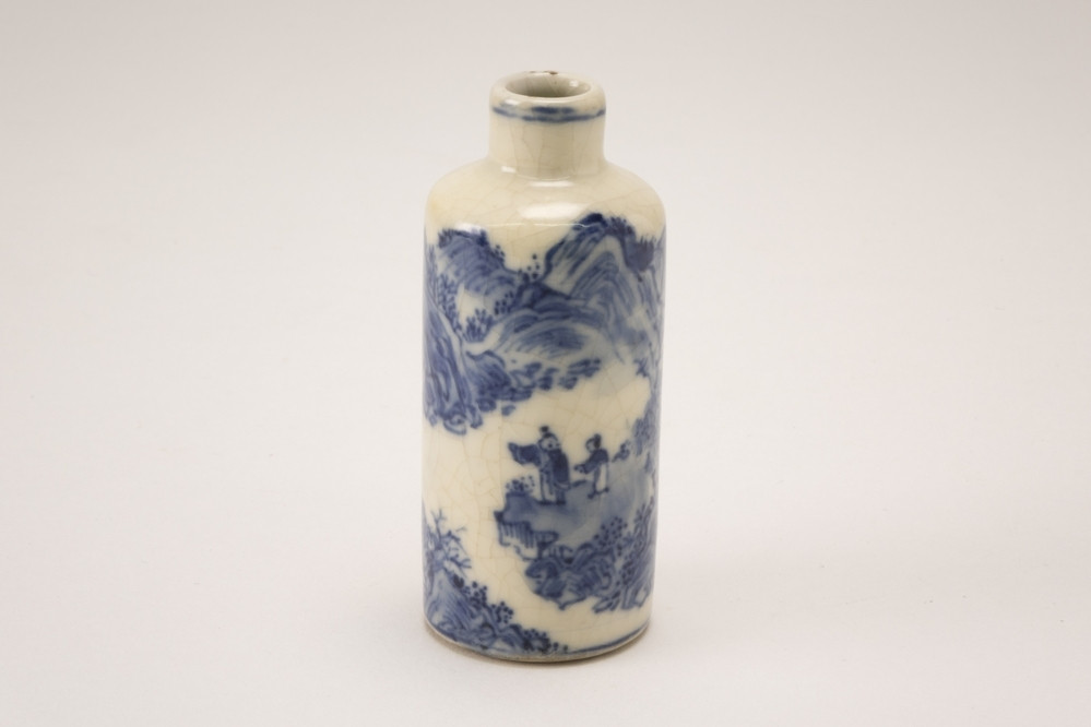 Porcelain, cylindrical form decorated in underglaze blue with a sage and his attendant gesticulating from a clearing by ...clouds and mountains ahead of them, the foot and neck with concentric rings. Chinese, Jingdezhen, 19th century.||JMD-P-1134