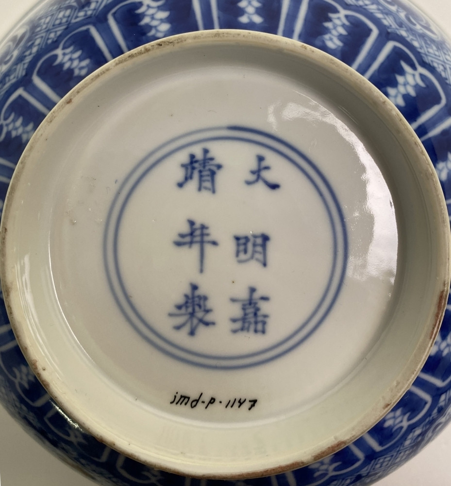Bowl on footring, spreading sides and mouthrim. Decorated in underglaze blue. A diaper motif on the outside. Around the ...of formally painted ware. The shou, the peach and the fungus (lingzhi) all symbolise long life and immortality.||JMD-P-1147
