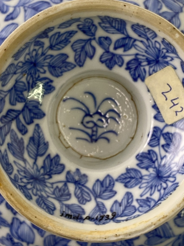 Tazza or bowl on tall foot. The hollow foot is formed by a domed base that supports a short, wide stem. On this the bowl...c. 1690 to 1710, but not much thereafter. This style can sometimes be seen on kraak porcelain, notably on ke...||JMD-P-1739