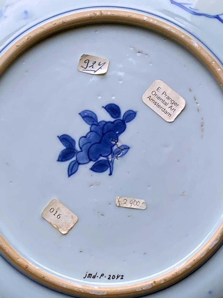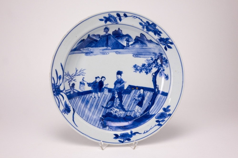 Dish on footring, wide flat rim. Decorated in underglaze blue. In the centre and on the sides a dignitary holding a scep... to those on the dish, cat. 49, which may indicate a serial production where only the centre decoration varied.||JMD-P-2042