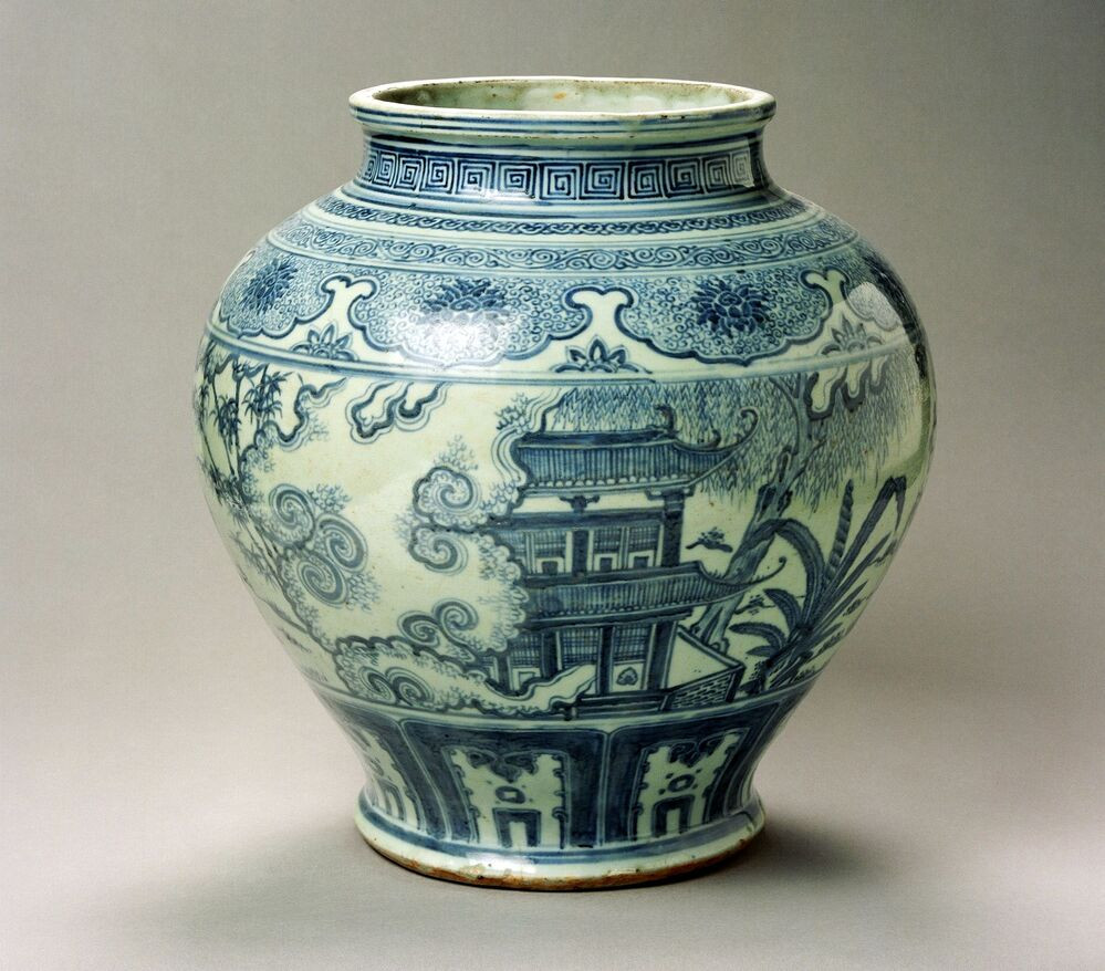 Large jar on footring, wide mouth, spreading foot. Decorated in underglaze blue with a continuous landscape with three h...rdy jar, painted in an accomplished and lively way, is unquestionably a highlight of the Van Diepen Collection.||JMD-P-2106