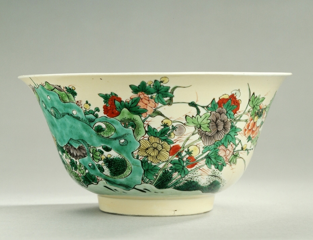 Bowl on footring, spreading rim. The outside is covered with a light-brown glaze. Famille verte, decorated in various sh... nature in miniature. Rock such as these represent mountain ranges and all that mountains and stones symbolise.||JMD-P-2355