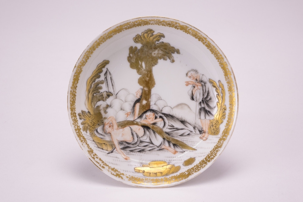 Teacup and saucer on footring, spreading sides. An encre de chine, iron-red and gold decoration of a landscape with roun...ion is unknown. Hervouët has suggested that it shows Christ discovering his sleeping disciples (Matthew 26:43).||JMD-P-2426
