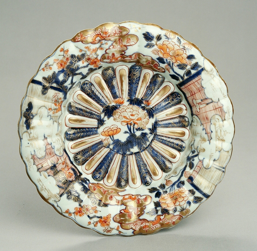Lobed dish on footring, the lobed rim hanging slightly downwards. A chrysanthemum modelled in low relief in the centre. ...otif in Japan. There are other variations of /…{plooischotels?J} dishes in the Shibata Collection (Arita 1998).||JMD-P-2692