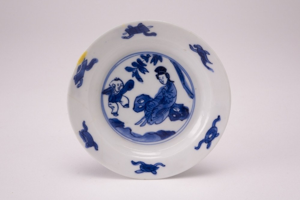 Rijksmuseum Amsterdam Bell-shaped cup and saucer with two figures in front of a pavilion and flower sprays